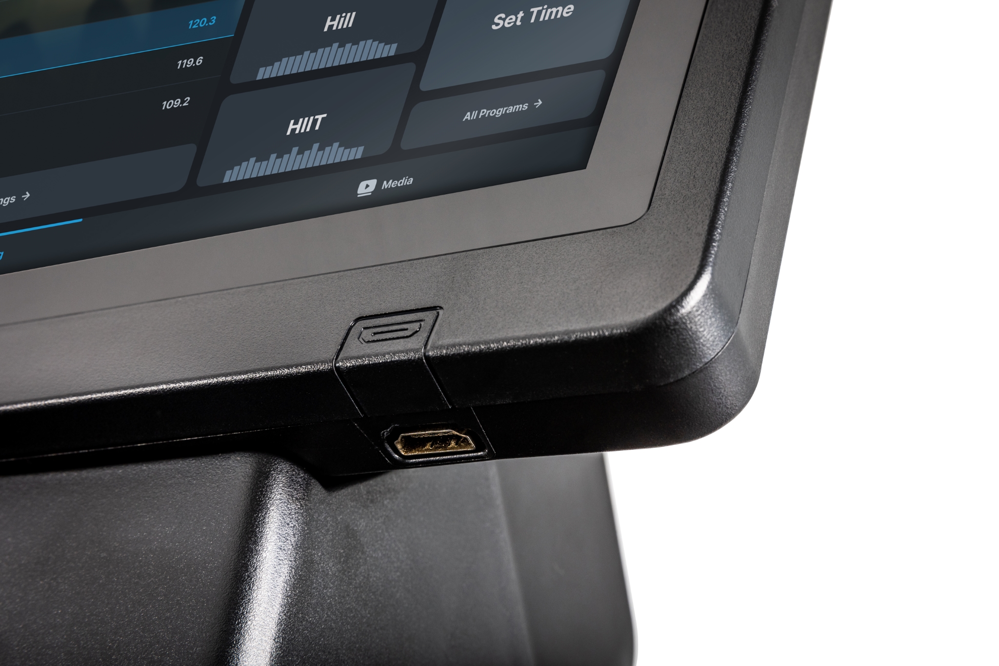 Charakter premium naszej bieżni oddaje również ultra-szeroki 21,5” ekran dotykowy TFT, który potęguje doświadczenia treningowe użytkownika. Stylowy wyświetlacz ze starannie zaprojektowanym interfejsem powstał z myślą o komforcie i łatwości obsługi. Dzięki możliwości podłączenia swojego urządzenia bezprzewodowo lub przez HDMI zyskujesz dostęp do zintegrowanych aplikacji.