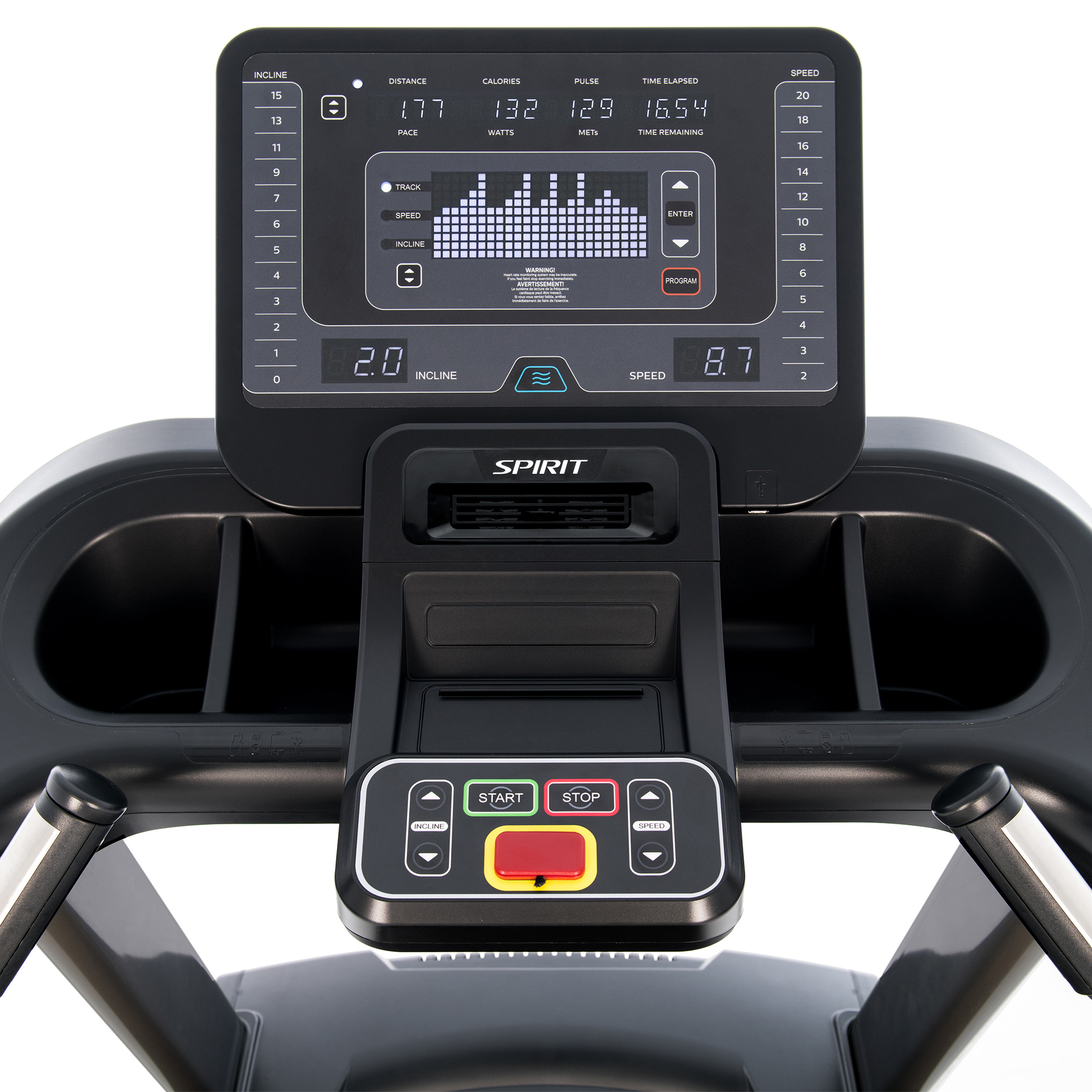 Bieżnia komercyjna CT800+ cieszy się opinią niezawodnej i wartej swojej ceny. Maszyna o wadze 173 kg charakteryzuje się wyjątkową wytrzymałością i licznymi funkcjami, które zadowalają klientów. Górny panel sterowania został zaprojektowany w sposób prosty i intuicyjny, z przyciskami prędkości i nachylenia, różnorodnymi opcjami przechowywania akcesoriów, a także z wbudowanym wentylatorem, który zapewnia użytkownikom komfort termiczny. Ergonomicznie rozmieszczone czujniki tętna umożliwiają łatwe monitorowanie istotnych parametrów, a wbudowane programy pozwalają na niemal nieograniczone dostosowywanie treningu do szerokiego zakresu poziomów sprawności.