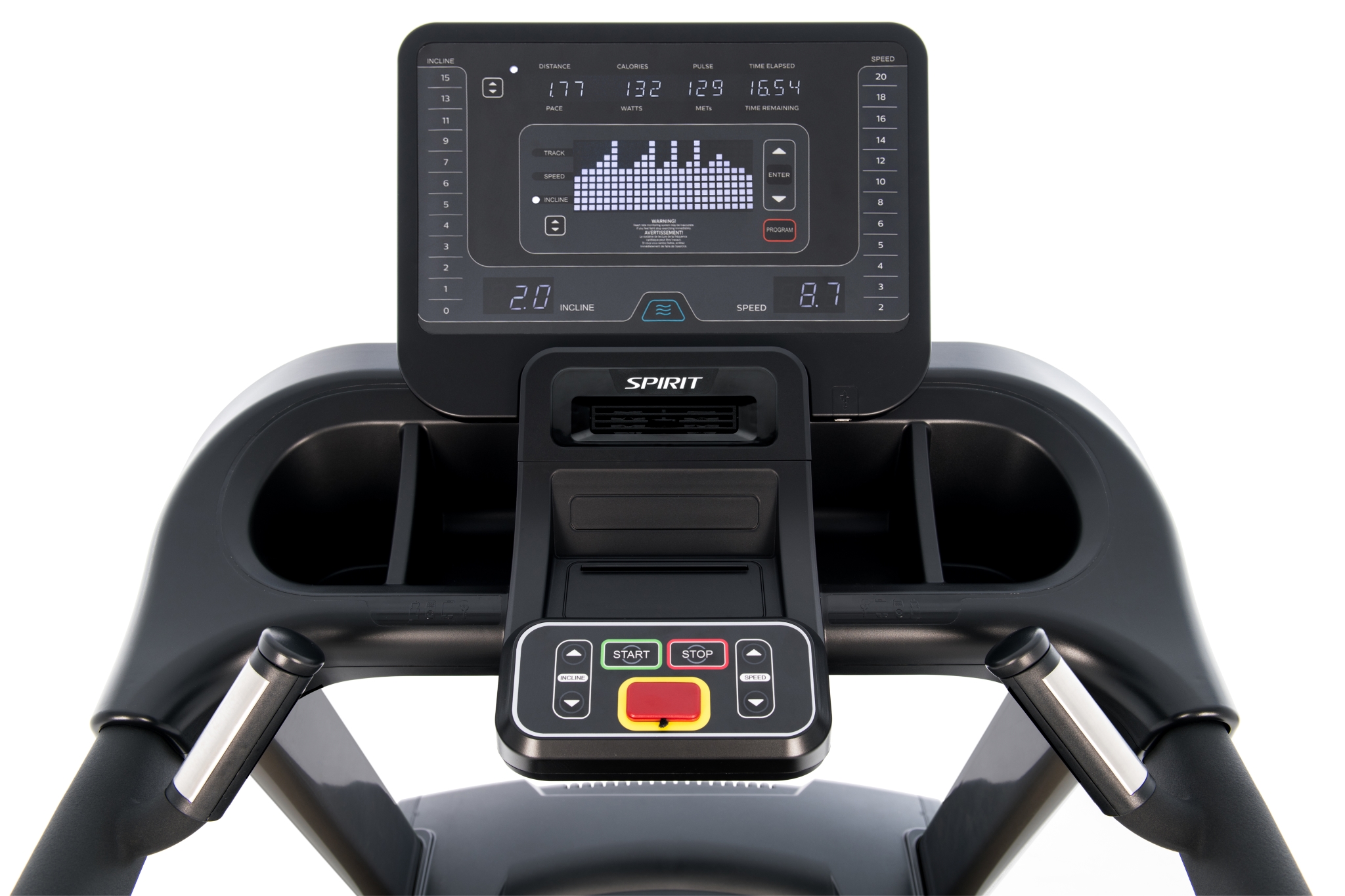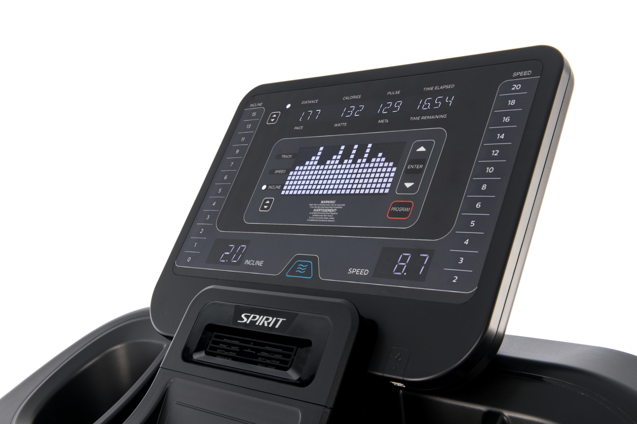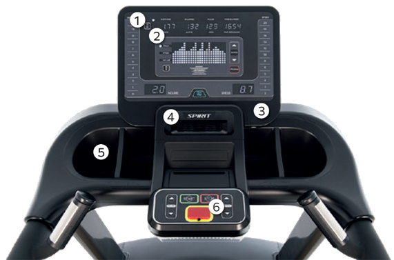 Konsola bieżni charakteryzuje się dużą funkcjonalnością, posiada przyciski szybkiego dostępu do regulacji prędkości i pochylenia, ergonomiczne schowki na butelki czy telefon. Komfort treningu zapewnia wbudowany wentylator.